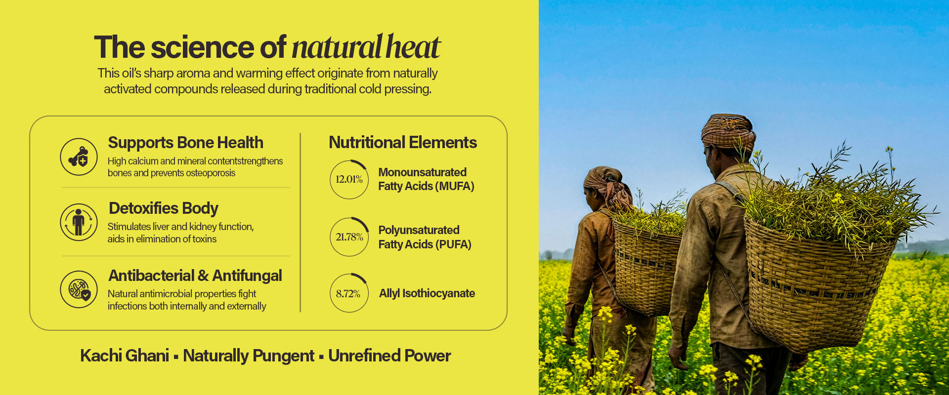 Authentic mustard oil from select Assam seeds. Processed using traditional methods to maintain strong flavor, rich aroma, and natural goodness. Filtered and packed with care.
